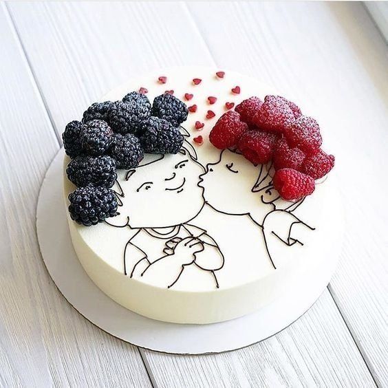 Очень милый тортик для влюбленных, украшенный малиной и ежевикой.